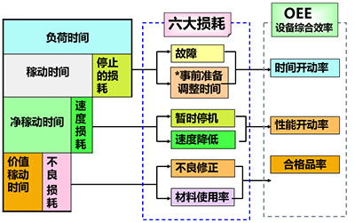 設(shè)備的OEE水平不高,是由多種原因造成的,而每一種原因?qū)EE的影響又可能是大小不同。在分別計(jì)算OEE的不同“率”的過(guò)程中,可以分別反映出不同類型的損失。