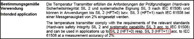(德語)Die Temperatur Transmitter erfüllen die Anforderungen der Prüfgrundlagen (Hardware Sicherheitsintegrit?t SIL2 und systematische Eignung SIL3 nach IEC61508) und k?nnen in Anwendungen bis SIL2 (HFT=0) bzw. SIL3 (HFT=1) nach IEC61508 bei einer Messgenauigkeit von 2% eingesetzt werden.
