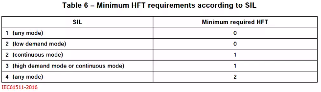 “11.4.5 The minimum HFT for a SIS (or its SIS subsystems) implementing a SIF of a specified SIL shall be in accordance with Table 6 and if appropriate 11.4.6 and 11.4.7.