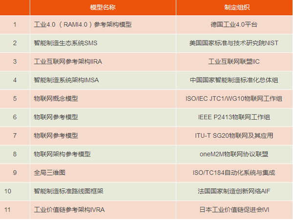 智能制造/工業(yè)4.0面向新的生產(chǎn)模式,實(shí)現(xiàn)跨企業(yè)、跨行業(yè)、跨地域的信息集成、應(yīng)用集成和價值集成。它是一個覆蓋信息通信(ICT)、自動化、裝備、軟件等寬泛領(lǐng)域和技術(shù)的“超級”系統(tǒng)工程,目前沒有一個學(xué)科能夠完全覆蓋所涉及的方方面面,因此,需要用標(biāo)準(zhǔn)化手段來統(tǒng)一認(rèn)識和引領(lǐng)發(fā)展,普遍的實(shí)施方法是通過制定智能制造/工業(yè)4.0的參考模型來梳理所涉及的相關(guān)標(biāo)準(zhǔn),進(jìn)而建立智能制造標(biāo)準(zhǔn)體系。IEC是制定智能制造/工業(yè)4.0國際標(biāo)準(zhǔn)的重要陣地,在IEC標(biāo)準(zhǔn)化管理局(SMB)系統(tǒng)評估組SEG7關(guān)于智能制造架構(gòu)和模型的報告中列出了眾多標(biāo)準(zhǔn)化組織已制定的11種參考模型和參考架構(gòu),具體名稱如表1所示。