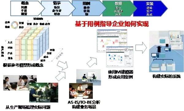 IVI提出IVRA的一個主要目的在于分析制造過程中哪里存在問題,并理清提供解決方案的系統(tǒng)范圍。因此,IVI在定義IVRA模型的同時,配套實(shí)施了一系列步驟,來推動IVRA在智能制造中得以真正應(yīng)用,如圖9所示。首先基于概念化的IVRA統(tǒng)一參考架構(gòu)模型,定義用戶(工廠)生產(chǎn)現(xiàn)場中存在的實(shí)際問題,經(jīng)過AS-IS/TO-BE分析,使用“IVI用例器”工具來形式化描述業(yè)務(wù)場景,最終指導(dǎo)在工廠中構(gòu)建實(shí)際的制造系統(tǒng)。這種標(biāo)準(zhǔn)化描述的業(yè)務(wù)場景更容易取得解決方案供應(yīng)商和制造用戶的一致理解。