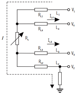 圖3 Rt為熱電阻,RL1為導(dǎo)線L1的等效電阻,RL2為導(dǎo)線L2的等效電阻,RL3導(dǎo)線L3的等效電阻,RL4導(dǎo)線L4的等效電阻