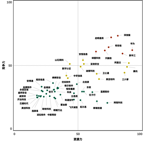 如上圖所示,“2020年CCIA中國(guó)網(wǎng)絡(luò)安全競(jìng)爭(zhēng)力50強(qiáng)”從競(jìng)爭(zhēng)力和資源力的維度,可以劃分為5個(gè)區(qū)域:產(chǎn)業(yè)領(lǐng)導(dǎo)者、互聯(lián)網(wǎng)巨頭、挑戰(zhàn)者、IPO準(zhǔn)備區(qū)和創(chuàng)新者。