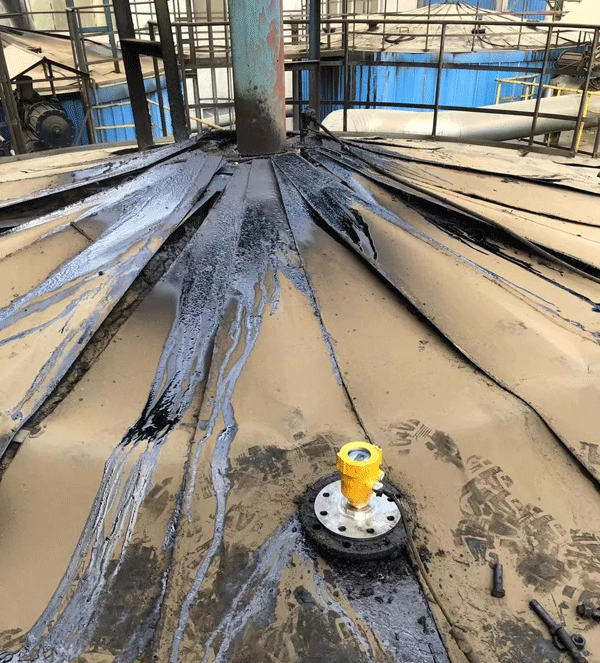 現(xiàn)場儲罐高度為7m,罐內(nèi)瀝青溫度220℃,罐內(nèi)有加熱盤盤管,且直徑較小;加熱盤管內(nèi)有高溫蒸汽,使瀝青一直保持在液態(tài);儀表安裝高度為7.5m,安裝法蘭為DN150。之前客戶選用的是26G喇叭口雷達(dá)物位計,由于瀝青的粘附性,即使喇叭口做了防塵罩保護, 喇叭口天線外部及底部天線罩有大量掛料,嚴(yán)重影響了雷達(dá)信號傳輸。