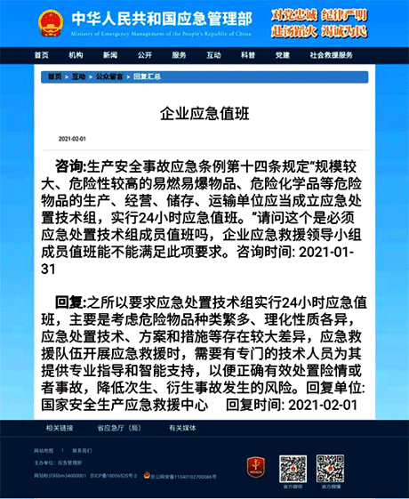 國家安全生產應急救援中心回復:之所以要求應急處置技術組實行24小時應急值班,主要是考慮危險物品種類繁多、理化性質各異,應急處置技術、方案和措施等存在較大差異,應急救援隊伍開展應急救援時,需要有專門的技術人員為其提供專業(yè)指導和智能支持,以便正確有效處置險情或者事故,降低次生、衍生事故發(fā)生的風險。回復單位: 國家安全生產應急救援中心 回復時間: 2021-02-01