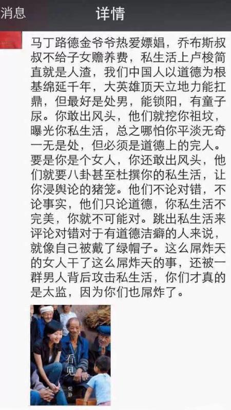 今天上午開始,朋友圈里的風(fēng)突然開始轉(zhuǎn)向,柴靜的私生活被扒出來。高齡產(chǎn)婦、抽煙、開大排量車,美國(guó)等等關(guān)鍵詞充斥。這么用心做的紀(jì)錄片,很多評(píng)論卻是集中在對(duì)柴靜私生活和片子瑕疵的議論上,而不是對(duì)霧霾的討論上。那些說片子沒有觸及深層原因的,現(xiàn)在正是你們站出來寫長(zhǎng)篇深度探討文章的時(shí)候。那些說片子論據(jù)有謬的,現(xiàn)在是拿出科學(xué)證據(jù)讓公眾知情的時(shí)候。一個(gè)席卷全國(guó)的熱點(diǎn)事件,讓嚴(yán)肅的環(huán)保討論得到了前所未有的高關(guān)注度,這樣千載難逢的機(jī)會(huì),可以搭順風(fēng)車做多少有意義的事情啊,而你卻在扒人家的私生活?