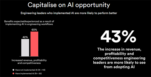 根據(jù)這項研究,與尚未實施AI的企業(yè)相比,已經(jīng)實施AI的工程團隊獲得收入、盈利能力和競爭力增長的可能性要高出43%。