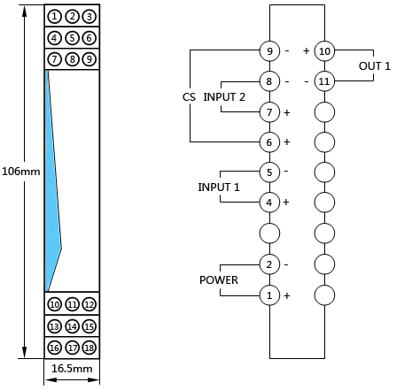 兩路輸入信號(hào)均為4-20mA,信號(hào)輸出控制方式為開(kāi)關(guān)量控制,輸出一路4-20mA信號(hào)