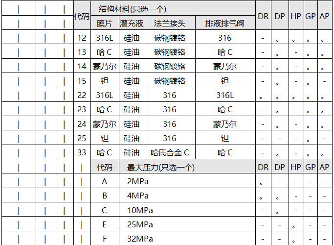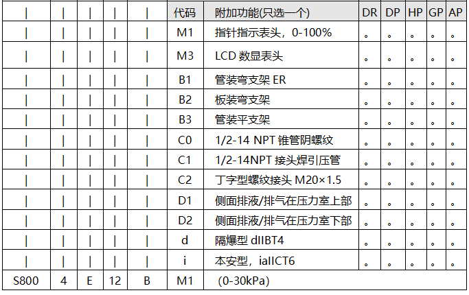 S800智能壓力變送器型譜表(“—”表示不提供)