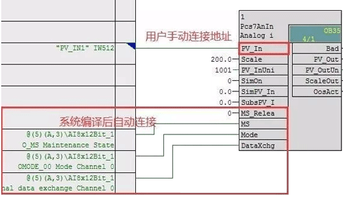 輸入驅(qū)動Pcs7AnIn:只需要將實(shí)際模擬量點(diǎn)地址連接至PV_In引腳,執(zhí)行CFC編譯,系統(tǒng)會根據(jù)硬件組態(tài)中該地址對應(yīng)的AI模板類型、通道設(shè)定等,自動識別該通道的信號類型。因此,無論是電流信號或是電壓信號,熱電阻或是熱電偶,程序中都可以使用同一個通道驅(qū)動信號而無需任何設(shè)置。