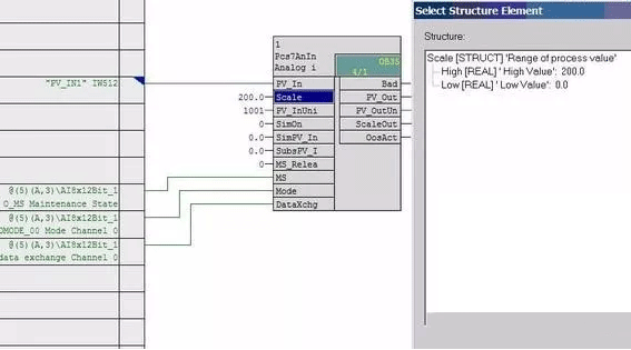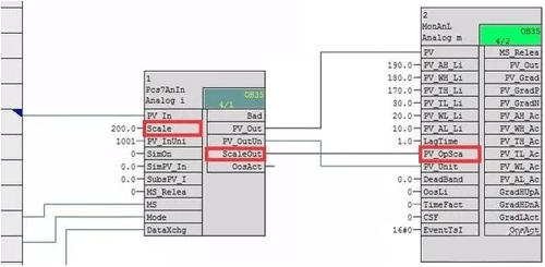 例如,此時通過通道驅(qū)動的信號處理,IW512的模擬量測量點(diǎn)量程為0-200,PV_Out為最終的轉(zhuǎn)換結(jié)果。如果設(shè)置Scale.High=Scale.Low,PV_Out則直接按信號類型進(jìn)行顯示,如顯示4-20mA, 0-10V等。量程設(shè)定值只需要設(shè)置一次,之后可以在功能塊之間傳遞,例如需要在上位機(jī)上顯示測量點(diǎn)量程,只需要將Pcs7AnIn的輸出參數(shù)ScaleOut連接到MonAnL的輸入?yún)?shù)PV_OpSca中,即可完成傳遞。