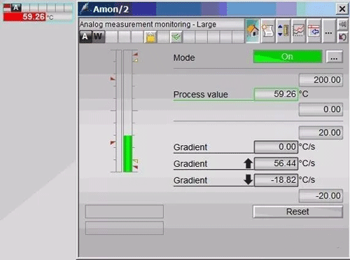 最終在上位機(jī)wincc上將顯示如下圖,左側(cè)為溫度的監(jiān)視塊,顯示實(shí)時溫度為59.26℃,右側(cè)為點(diǎn)擊該塊后為彈出畫面,詳細(xì)顯示了它的報(bào)警情況,模式,梯度變化設(shè)置,高低限,趨勢,事件等。
