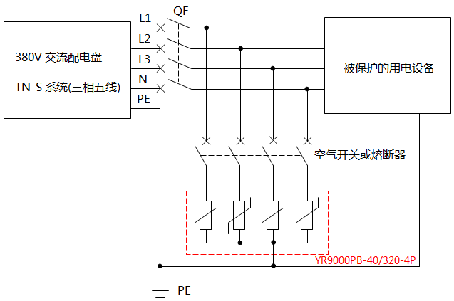 ①TN-C-S系統(tǒng)中總進(jìn)線配電箱處裝設(shè)3P三相交流電源SPD(推薦型號(hào)為YR9000PB-40/320-3P),N線上不必裝設(shè),下級配電箱處需裝設(shè)4P三相交流電源SPD(推薦型號(hào)為YR9000PB-40/320-4P);
