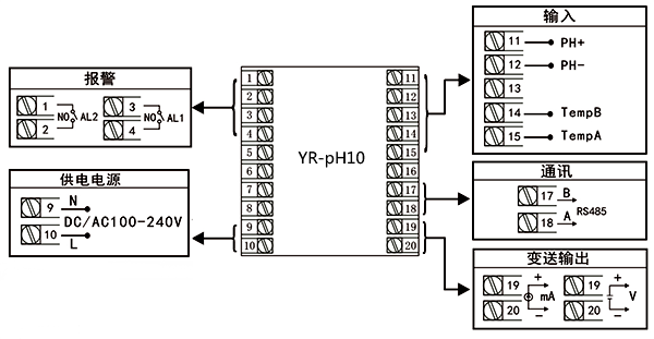YR-PH10系列pH/ORP監(jiān)測儀應(yīng)用于環(huán)保水處理、純凈水、循環(huán)水、鍋爐水等系統(tǒng)以及電子、電鍍、印染、化學(xué)、食品、制藥等制程領(lǐng)域的pH/ORP實時顯示和控制。pH/ORP監(jiān)測儀采用高阻抗和戶外防水設(shè)計,測量穩(wěn)定不跳字,抗干擾能力強,具備一路RS485通訊輸出、一路模擬信號輸出和兩路繼電器報警輸出,方便用戶構(gòu)成水質(zhì)采集分析控制系統(tǒng)。