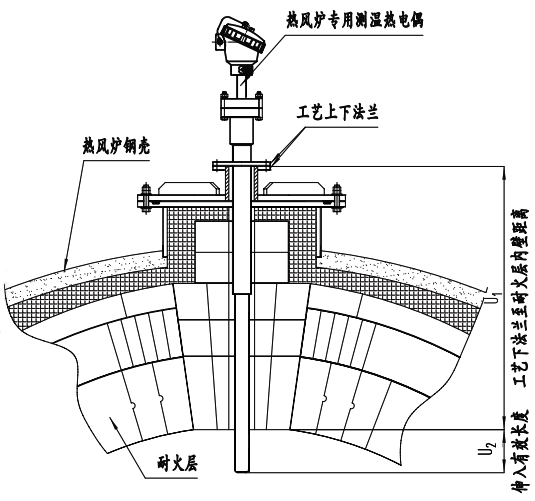 注意:上圖U2指熱風(fēng)爐熱電偶深入熱風(fēng)爐內(nèi)的有效長度,這個長度很重要:深入有效長度太長測量的不是燃熱風(fēng)爐內(nèi)燒區(qū)的平均溫度