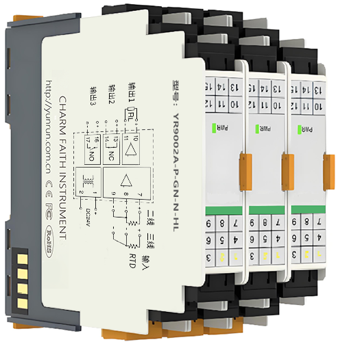 熱電阻信號報警設(shè)定器YR9002A把現(xiàn)場的兩線制或三線制熱電阻信號隔離轉(zhuǎn)換為4-20mA信號輸出,同時據(jù)用戶設(shè)定的量程、報警點、報警方式等參數(shù),送出兩路繼電器報警輸出。熱電阻信號報警設(shè)定器功能相當(dāng)于帶兩個報警輸出+1路4-20mA電流輸出的熱電阻溫度變送器。