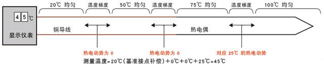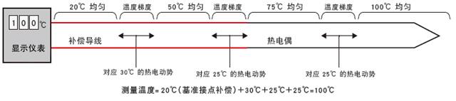 由于感溫部位存在溫度梯度,補(bǔ)償導(dǎo)線上也會(huì)產(chǎn)生與該溫度差相當(dāng)?shù)臒犭妱?dòng)勢(shì)。熱電偶顯示儀表計(jì)算產(chǎn)生的熱電動(dòng)勢(shì)的合計(jì)值,并顯示為溫度。