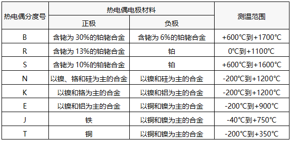 B型熱電偶、R型熱電偶、S型熱電偶被稱為貴金屬熱電偶,而N型熱電偶、K型熱電偶、E型熱電偶、J型熱電偶、T型熱電偶被稱為廉金屬熱電偶。含有鉑、銠等熔點(diǎn)較高金屬的貴金屬熱電偶被用來(lái)測(cè)量+1000℃以上的溫度,而廉金屬熱電偶則常用于測(cè)量+1000℃以下的溫度。
