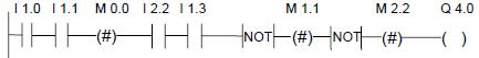 如果輸入端I0.0的信號(hào)狀態(tài)為“1”,I0.1的信號(hào)狀態(tài)為“0”,則置位存儲(chǔ)器位M0.0,輸出Q4.0將是“0”。否則,如果輸入端I0.0的信號(hào)狀態(tài)為“0”,I0.1的信號(hào)狀態(tài)為“1”,則復(fù)位存儲(chǔ)器位M0.0,輸出Q4.0將是“1”。如果兩個(gè)信號(hào)狀態(tài)均為“0”,則不會(huì)發(fā)生任何變化。如果兩個(gè)信號(hào)狀態(tài)均為“1”,將因順序關(guān)系執(zhí)行置位指令;置位M0.0,Q4.0將是“1”。