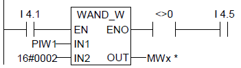 字PIW1包含I1.1的立即狀態(tài)。對(duì)PIW1與W#16#0002執(zhí)行AND運(yùn)算。如果PB1中的I1.1(第二位)為真(“1”),則結(jié)果不等于零。如果WAND_W指令的結(jié)果不等于零,觸點(diǎn)A<>0時(shí)將傳遞電壓。