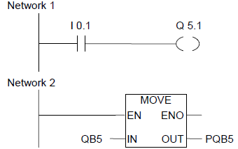 在此實(shí)例中,Q5.1為所需的立即輸出位;字節(jié)PQB5包含Q5.1位的立即輸出狀態(tài);MOVE(復(fù)制)指令還會(huì)更新PQB5的其它7位。