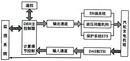 數(shù)字電液控制系統(tǒng)(Digital Electric-Hydraulic Control System,DEH)是保證汽輪機(jī)經(jīng)濟(jì)運(yùn)行必不可少的條件。汽輪機(jī)DEH的任務(wù)是根據(jù)控制指令(目標(biāo)轉(zhuǎn)速、負(fù)荷及其變化率),控制運(yùn)行方式、閥門試驗(yàn)方式、機(jī)組狀態(tài)參數(shù)和轉(zhuǎn)速、發(fā)電機(jī)功率等被控量,通過數(shù)字控制器輸出控制信號(hào),經(jīng)與反饋信號(hào)比較后,其偏差經(jīng)過伺服放大后,送到電液轉(zhuǎn)換器,自動(dòng)控制進(jìn)汽量,以改變蒸汽轉(zhuǎn)矩,在轉(zhuǎn)速改變不大的情況下,達(dá)到新的平衡,以適應(yīng)外界負(fù)荷或蒸汽狀態(tài)的變化。