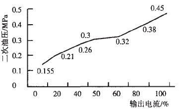 為了確認(rèn)調(diào)速系統(tǒng)是否工作正常,在機(jī)組冷態(tài)下進(jìn)行了靜態(tài)試驗(yàn)。所謂靜態(tài)實(shí)驗(yàn)是指對(duì)電液轉(zhuǎn)換器進(jìn)行整定,使PEAK150的驅(qū)動(dòng)電流、二次油壓、調(diào)門(mén)開(kāi)度類(lèi)似于線性關(guān)系,符合設(shè)計(jì)要求(如圖2,圖3所示),保證調(diào)速汽門(mén)按照PEAK150的控制信號(hào)進(jìn)行動(dòng)作,從而實(shí)現(xiàn)PEAK150對(duì)進(jìn)汽量和轉(zhuǎn)速的準(zhǔn)確控制。