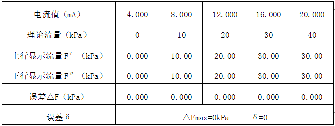 差壓式流量計的差壓變送器4-20mA(量程為0-40kPa)輸出的校準數(shù)據(jù)