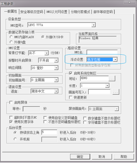 浮點數(shù)讀取(雙字也稱四字節(jié)浮點數(shù)),浮點數(shù)存放格式在HMI中有兩種選擇:低位在前和高位在前,在菜單設置----工程設置,打開如圖: