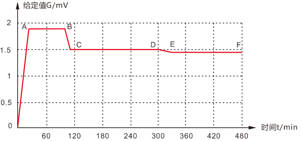 ②控溫:溫控器給定值置2.00mV,60段可編程溫控儀曲線見圖5,溫控器的實際給定值是2.00mV加上某一時刻程序給定儀之值。