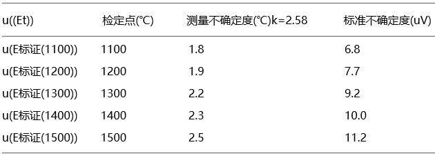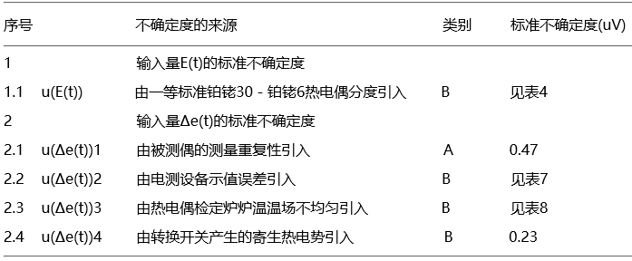 輸入量E標證(t)的標準不確定度來源于分度一等標準鉑銠30-鉑銠6熱電偶,分度結果的不確定度,由相關資料可知,換算成熱電勢值見表4: