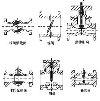 閥體種類多于驅(qū)動(dòng)裝置種類,根據(jù)閥門類型、口徑大小和流體條件進(jìn)行選擇。有角形閥、三通閥、隔膜閥、閘閥、蝶閥、球閥、偏心旋轉(zhuǎn)閥等。