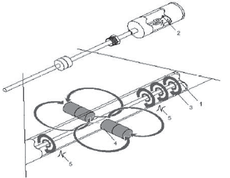 主要是利用磁致伸縮的物理特性進行測量,不受介質(zhì)的介電常數(shù)、溫度或壓力變化的影響。如圖1所示,在非磁性傳感管的內(nèi)部有一根拉緊的磁致伸縮線1,電路單元沿磁致伸縮線發(fā)射電流脈沖2,從而在磁致伸縮線周圍產(chǎn)生一個環(huán)形的磁場3,液位浮子內(nèi)有一組永久磁鋼4,它們本身的磁場使磁致伸縮線沿軸向磁化。當電流磁場和磁鐵磁場疊加,浮子位置的磁致伸縮伸縮線將產(chǎn)生一個瞬時扭力5,同時產(chǎn)生返回脈沖,該脈沖沿磁致伸縮線向兩端傳送,一端傳向傳感管的頂端,另一端傳向傳感管的底部。其中向頂端返回的脈沖波會被變送器電子單元所接收。由于脈沖波的傳播速度是恒定值,電子單元只需通過起始脈沖和返回脈沖的時間差就可以計算出浮子中磁鋼的位置,從而得到精確的液位。