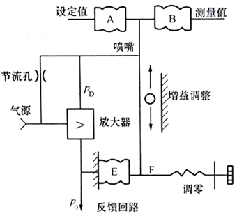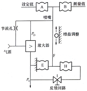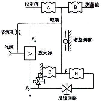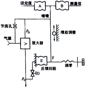 一個假想的氣動比例調(diào)節(jié)器原理如圖1所示。誤差的檢測由波紋管A和B來實現(xiàn),測量值或設定值的任何變化都將導致?lián)醢宓囊苿?,?jīng)噴嘴擋板機構放大后,至功率放大器再進行功率放大,其輸出P0又經(jīng)反饋波紋管E和驅(qū)動桿F作用于擋板,最后使調(diào)節(jié)器輸出P0穩(wěn)定在某一值,并實現(xiàn)與測量值和設定值之差成比例。氣動調(diào)節(jié)器的比例增益可通過改變增益調(diào)整球的上下位置進行整定,氣動調(diào)節(jié)器的輸出零點可通過調(diào)零彈簧進行調(diào)整,氣動調(diào)節(jié)器正作用、反作用可通過改變測量信號和設定值信號輸入波紋管A和B的方法來實現(xiàn)。在圖中,測量信號進入波紋管B,設定信號進入波紋管A,氣動調(diào)節(jié)器是正作用如果改為測量信號進入A,設定信號進入B,則變?yōu)榉醋饔谩?/span>
