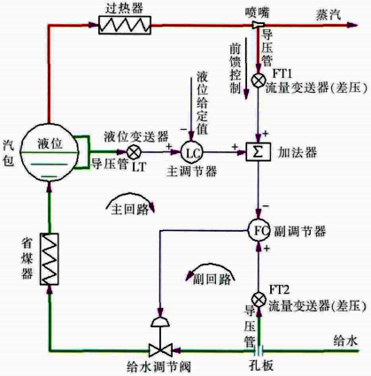 在鍋爐穩(wěn)定運(yùn)行過(guò)程中,汽包液位(以下簡(jiǎn)稱液位)的控制是最重要的環(huán)節(jié)之一。液位過(guò)高會(huì)影響汽水分離的效果,產(chǎn)生蒸汽帶液現(xiàn)象;液位過(guò)低會(huì)破壞水循環(huán),嚴(yán)重時(shí)會(huì)燒壞鍋爐。當(dāng)蒸汽負(fù)荷突然增大時(shí),鍋爐會(huì)出現(xiàn)暫時(shí)的壓力下降,水的沸騰加劇,導(dǎo)致液位上升,這就產(chǎn)生了虛假液位。這時(shí)本應(yīng)把給水量加大,但如果采用簡(jiǎn)單的單沖量調(diào)節(jié)系統(tǒng),就會(huì)根據(jù)這個(gè)假液位而錯(cuò)誤地把鍋爐給水調(diào)節(jié)閥關(guān)小,減少給水量,等到汽水達(dá)到新的動(dòng)態(tài)平衡時(shí),液位就下降了許多,遠(yuǎn)離給定值,甚至使鍋爐發(fā)生危險(xiǎn)。如果蒸汽負(fù)荷驟降,它的變化過(guò)程和結(jié)果與上述相反,從而使汽包液位發(fā)生較大的波動(dòng)。由此可以看出,影響液位的主要因素是鍋爐的汽水平衡。為了克服負(fù)荷變化引起的液位大幅度波動(dòng),消除假液位的影響,提前消除蒸汽流量對(duì)液位的干擾,除了主調(diào)節(jié)回路的液位變量以外,還引入了作前饋信號(hào)的蒸汽流量和作串級(jí)副回路測(cè)量信號(hào)的給水流量?jī)蓚€(gè)輔助變量。而主調(diào)節(jié)回路(以下簡(jiǎn)稱主回路)、副調(diào)節(jié)回路(以下簡(jiǎn)稱副回路)及前饋控制構(gòu)成了鍋爐汽包的串級(jí)三沖量控制系統(tǒng),其中三沖量分別指汽包液位、蒸汽流量和給水流量這三個(gè)變量。