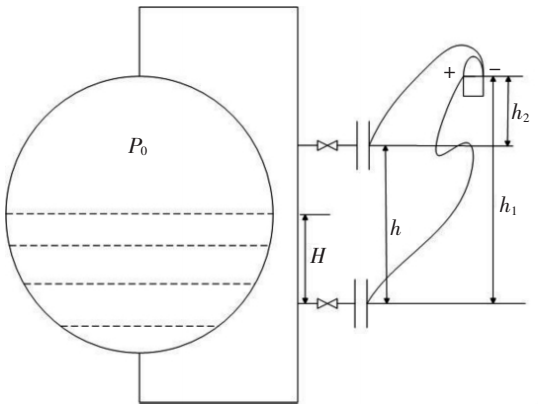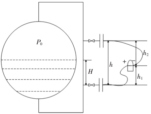 圖2中,H為高加內的實際液位;h為高加內的上部法蘭和下部法蘭之間的距離;h1為變送器負壓側和高加上部法蘭之間的高度;h2 為變送器正壓側和高加下部法蘭之間的高度;P0 為設計工況下高加內的壓力;ρ水為設計工況下高加內水的密度;ρ介為毛細管內所充介質的密度。