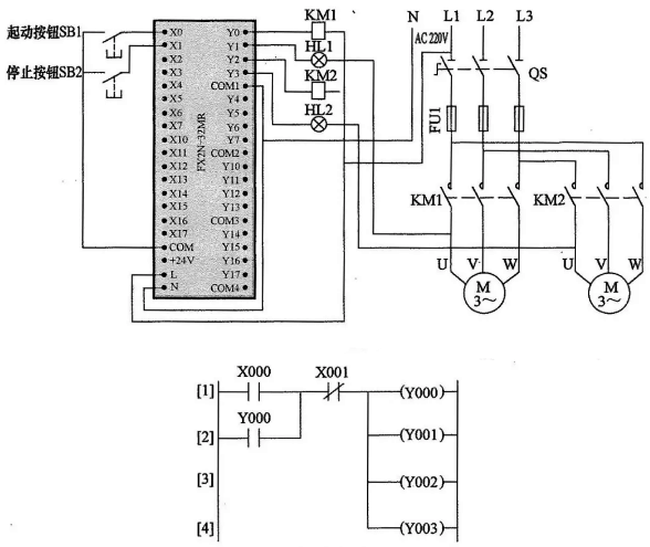 3、多地控制的PLC線路與梯形圖