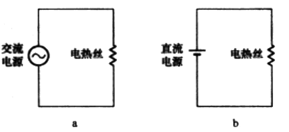 圖3所示兩個電路中的電熱絲完全一樣,現(xiàn)分別給電熱絲通交流電和直流電,如果兩電路通電時間相同,并且電熱絲發(fā)出熱量也相同,對電熱絲來說,這里的交流電和直流電也等效的,那么久將圖3b中直流電的電壓值或電流值稱為圖3a中交流電的有效電壓值或有效電流值。