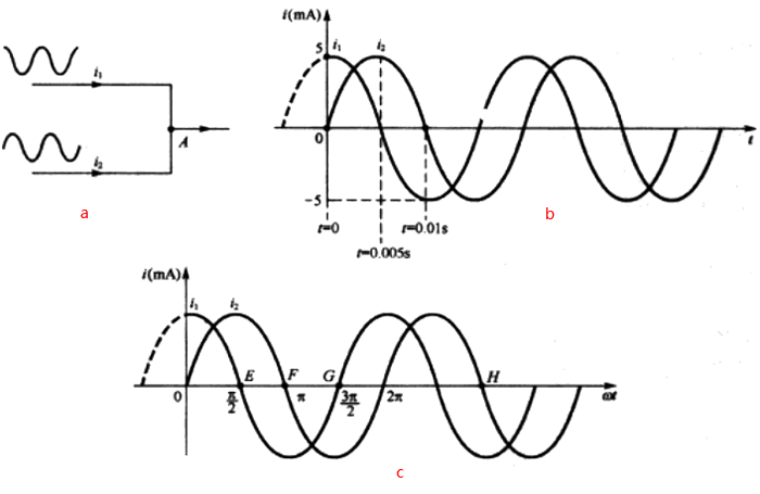 相位差是兩個同頻率交流電的相位之差。如圖6a、圖6b所示,兩個同頻率的交流電流i1、i2分別從兩條線路流向A點,在同一時刻,達到A點的i1、i2交流電的相位并不相同,在t=0時刻,i1的相位為π/2,而i2相位為0°,在t=0.01s時刻,i1的相位為3π/2,而i2相位為π,兩個電流的相位差為(π/2-0)=π/2或(3π/2-π)=π/2,即i1、i2的相位差始終是π/2。在圖6b中若將i1的前一段補償出來(虛線所示),也可以看出i1、i2的相位差是π/2,并且i1超前i2 π/2(90°)。