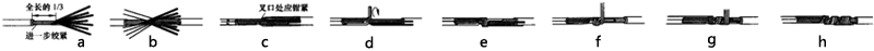 如圖4a所示首先把兩個多股導(dǎo)線散開拉直,并將占全長三分之一的導(dǎo)線絞緊,然后把剩下三分之二部分導(dǎo)線分散成傘狀,把兩股導(dǎo)線的傘狀芯線頭隔根對插(如圖4b),并將其中一端的芯線分成三組。將第一組的芯線扳起并垂直于芯線,按順時針方向緊繞2圈(見圖4c、d),把第二組的芯線仍按順時針方向緊緊壓住前面的芯線,纏繞2圈(見圖4f),把最后一組的芯線按上述方法順時針方向緊緊壓住前芯線纏繞4圈(見圖4g).最后切去每組多余長度的芯線,平整端部,去除毛刺。用上述方法纏繞另一邊芯線(見圖4h)。