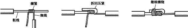 連接方法如圖2所示,先在兩導(dǎo)線的芯線重疊處填入一根相同直徑的芯線,再用一根截面約1.5mm2的裸銅線在其上緊密纏繞,纏繞長度為導(dǎo)線直徑的10倍左右,然后將被連接導(dǎo)線的芯線線頭分別折回,再將兩端的纏繞裸銅線繼續(xù)纏繞5-6圈后剪去多余線頭即可。