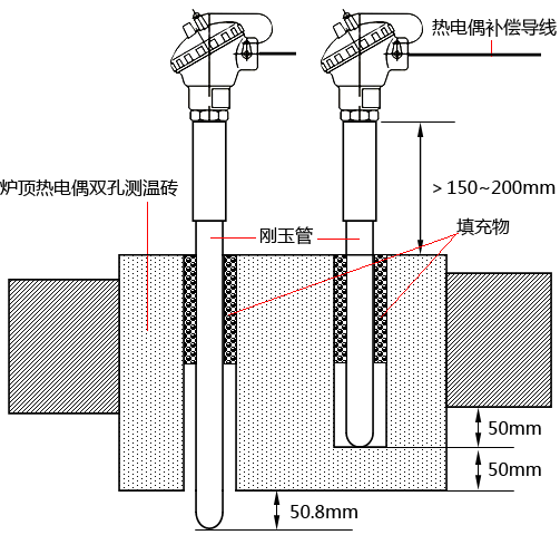 同時(shí)插入熱電偶的孔與熱電偶剛玉管之間的空隙,必須要用玻璃棉、玻璃纖維等填充物將此空隙堵嚴(yán),以防產(chǎn)生“煙囪效應(yīng)”(Chimney Effect),使火焰從空隙處沖出燒毀熱電偶與補(bǔ)償導(dǎo)線等。
