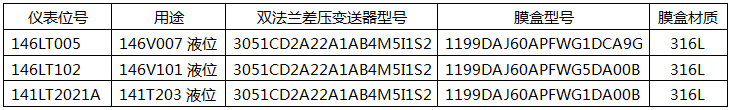 根據(jù)凈化裝置變換部分的合成氣和凝液的的成份組成(有CL-、S+、H+及灰份固體顆粒)和雙法蘭差壓變送器的選型原則,測(cè)量氯腐蝕、硫腐蝕、氫脆工況應(yīng)選用316L加厚鍍金的雙法蘭差壓變送器。測(cè)量凈化裝置H2S濃縮塔141T203的塔底液位141LT2021A與介質(zhì)接觸的隔離膜片的材質(zhì)可以是純金屬鉭。