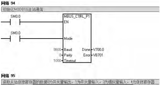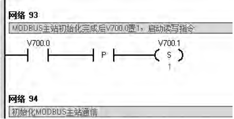 其中,EN-使能:必須保證每一掃描周期都被使能;Mode-模式:常為1,使能Modbus協(xié)議功能;Baud-波特率:設(shè)置要與從站對應(yīng),本例設(shè)為9600;Panty-校驗:0為無校驗;Timeout-超時:主站等待從站相應(yīng)時間,這個值必須足夠大以保證從站有時間響應(yīng);Done-完成位:初始化完成,自動置位,可用于啟動MBUS_MSG程序;Er-ror-初始化錯誤。初始化完成后,啟動讀寫指令V700.1。程序如圖6所示。