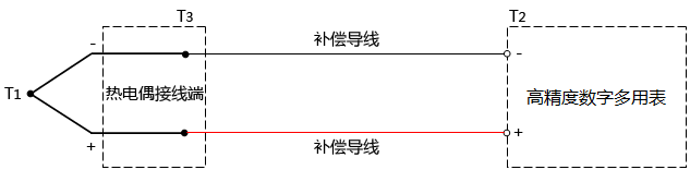 從理論上分析,根據(jù)熱電偶的均質(zhì)導(dǎo)體定律,均質(zhì)導(dǎo)體的熱電勢(shì)僅與兩端頭接點(diǎn)的溫度有關(guān),而與沿?zé)犭姌O的溫度分布無(wú)關(guān)。所以采用偶絲直接連接,熱電偶的兩個(gè)電極由偶絲直接延伸到冰點(diǎn),中間溫度T3完全可以不考慮(見(jiàn)圖1)。