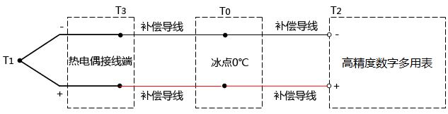 ②認(rèn)為接補(bǔ)償導(dǎo)線更好,不僅在熱電偶到冰點(diǎn)之間連接用補(bǔ)償導(dǎo)線,在冰點(diǎn)0℃到高精度數(shù)字多功能表之間也用補(bǔ)償導(dǎo)線連接,如圖3所示。