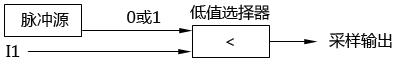 低值選擇器與高值選擇器可以用作通斷器或采樣器。圖10用低值選擇器作通斷器,定值器只規(guī)定兩種信號0(儀表信號的零位)與1(儀表信號的上限)。當(dāng)IR為0時,I1信號被阻斷;當(dāng)IR為1時,I1信號通。圖11正好相反,當(dāng)IR為0時,I1信號通;當(dāng)IR為1時,I1信號被阻斷。圖12用脈沖源代替定值器,脈沖源的輸出信號在0和1之間周期性地變化,信號I1忽而通,忽而斷,形成同脈沖周期一樣的周期信號。