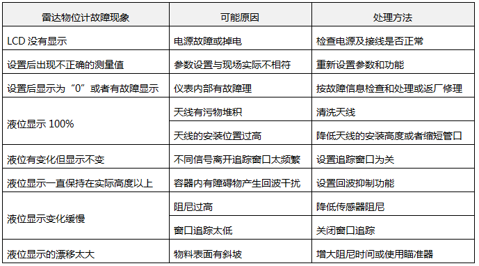 雷達(dá)物位計(jì)常見故障產(chǎn)生的原因及處理方法見表1。