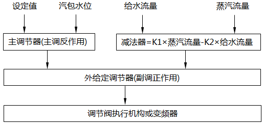從圖1知,汽包水位調(diào)節(jié)器的輸出信號作為外給定調(diào)節(jié)器控制信號、蒸汽流量信號、給水流量信號(負(fù)信號)一同送進(jìn)減法器進(jìn)行運算,減法器的輸出作為外給定調(diào)節(jié)器測量信號,外給定調(diào)節(jié)器輸出控制調(diào)節(jié)閥的開度。