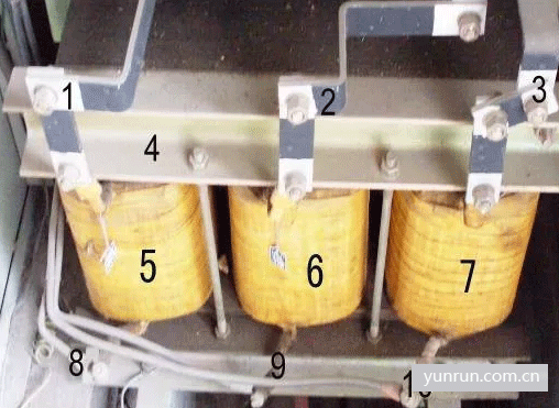 1、2、3為鋁排(導(dǎo)線),4為自耦變壓器鐵心(局部),5、6、7為自耦變壓器繞組,8、9、10為銅纜(導(dǎo)線),1、8為自耦變壓器繞組5的兩根出線,2、9為自耦變壓器繞組6的兩根出線,3、10為自耦變壓器繞組7的兩根出線,各個(gè)繞組的抽頭在圖中各繞組后面(圖中看不見)